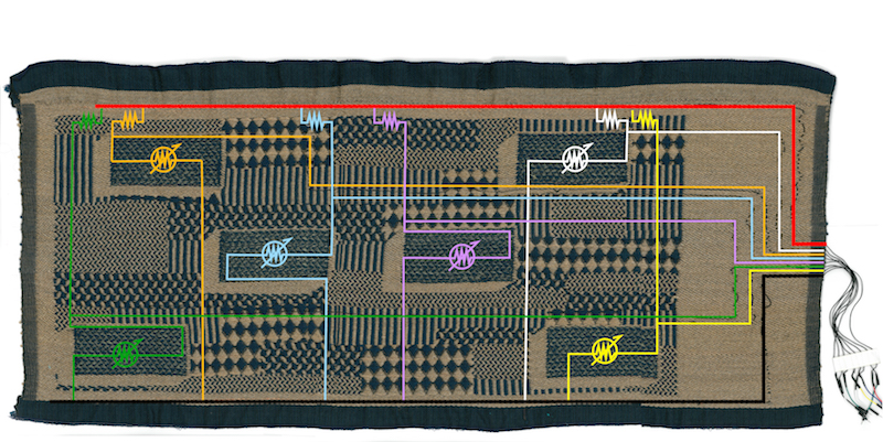 A Fabric that remembers is a fabric that remembers how, when and where it was pressed. It does this using 6 embedded pressure sensors and a microconroller that transmits data to the web.