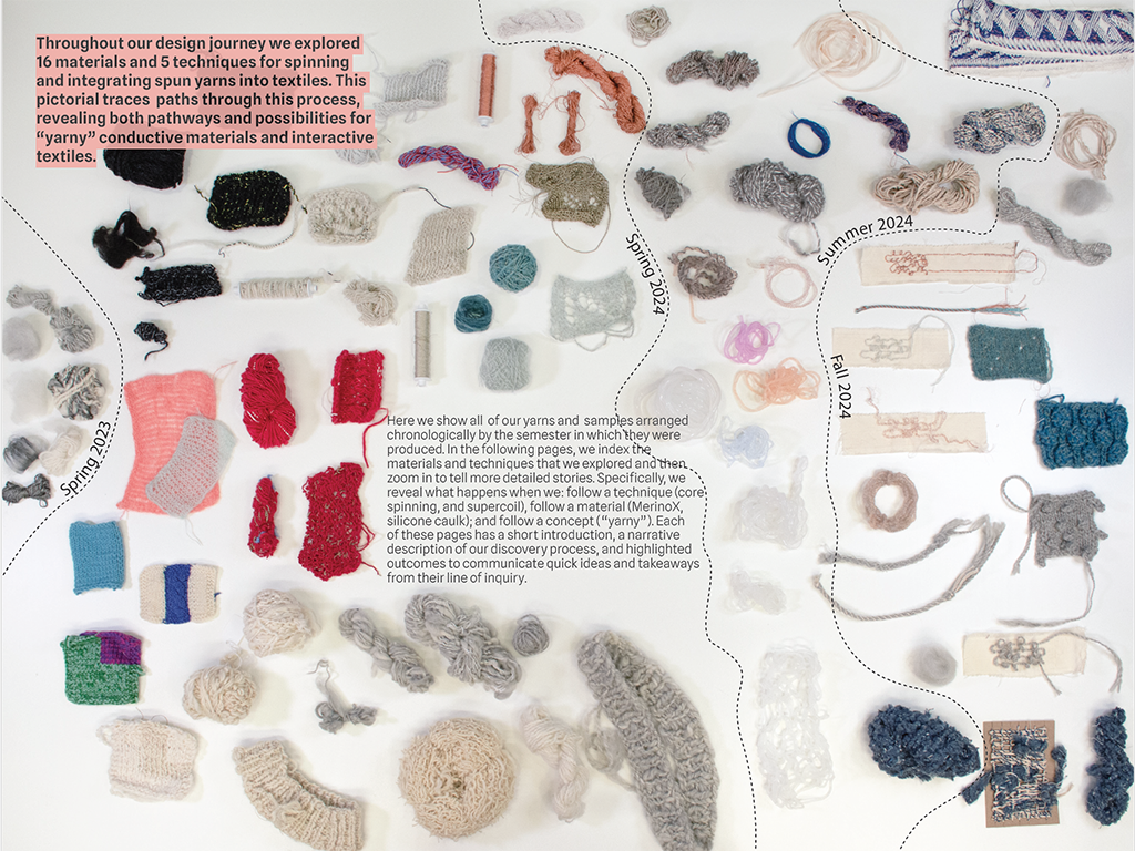 The ability to create a wide and varied set of interactive textiles depends on the materials that one has available. Currently, the range of yarns that can be used to bring interactivity to textiles is greatly limited, especially considering the diversity available in non-conductive yarns. This pictorial traces a design journey into hand spinning that seeks to address this limitation and contributes samples of techniques and materials that could be used to create conductive yarns along with reflection on design methods that enabled us to explore a wider range of aesthetic expressions. We advocate for an approach that reconnects with the textiles in e-textiles, embraces divergence, and prioritizes the material rather than function as the driver of a design concept. We offer pathways for readers and researchers to continue this exploration within varied domains and practices.